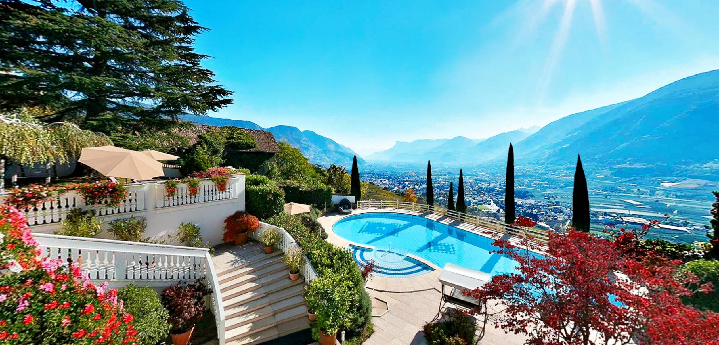 Zum Verlieben. Zeitlos schön. Paradiesisch. Atemberaubend. Beeindruckend. Einzigartig. Unvergesslich. All diese Eigenschaften bringen den wunderbaren 270° Ausblick auf die namensgebende Stadt & die Berge vom Meranerland von unserem einzigartigen Hotel bei Meran in Dorf Tirol zum Ausdruck.