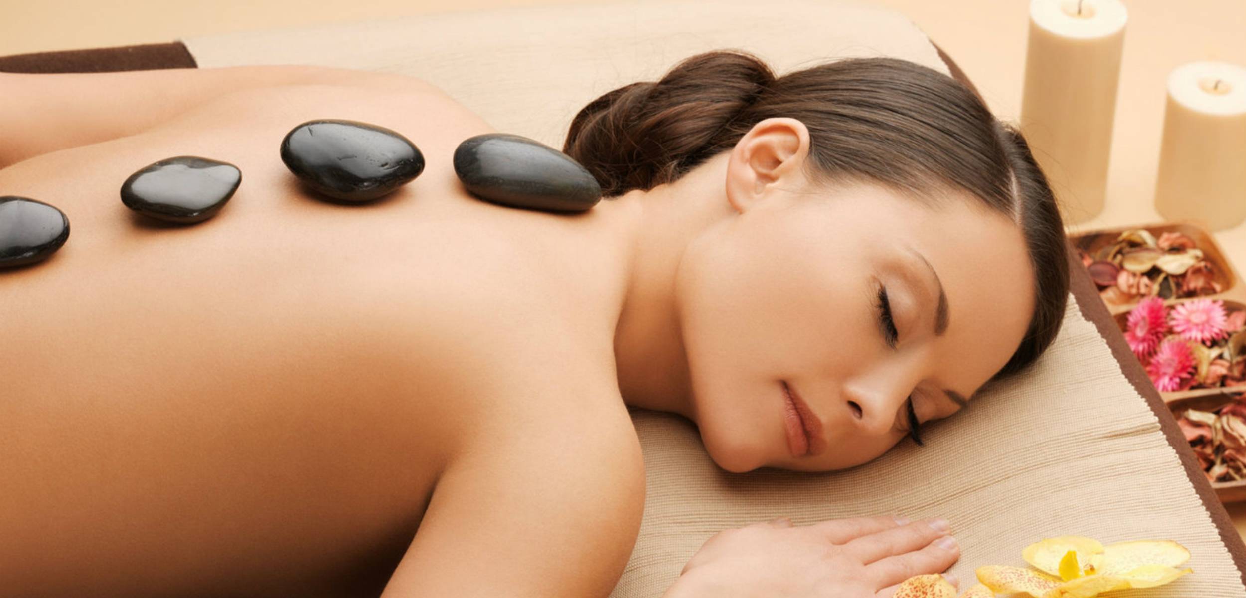 | Hot Stone-Massage (50 Min). Sie ist eine tiefe Entspannungsmassage mit warmen Basalt-Steinen und wertvollen ätherischen Ölen. |